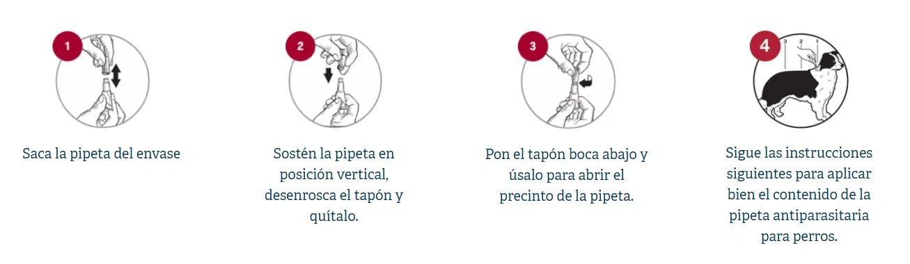 En perros de más de 10 kg de peso: debe aplicarse todo el contenido de la pipeta uniformemente entre cuatro puntos sobre la línea dorsal del animal, desde la zona de los hombros hasta la base de la cola.